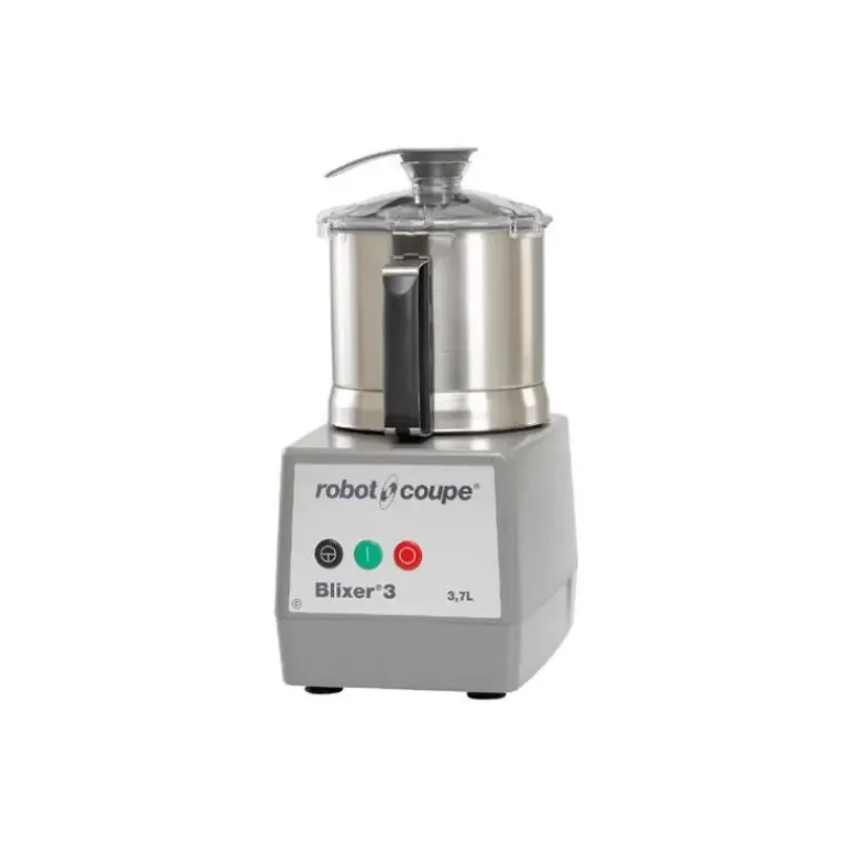 Le Blixer 3 Robot Coupe se compose d’une cuve en inox avec poignée de 3.7 litres et qui repose sur un support moteur métallique. La cuve renferme un bras racleur et un couteau denté. Tous les éléments en contac avec les aliments sont faciles à nettoyer et à repositionner.
