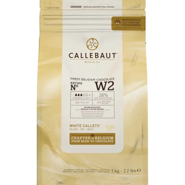 Le chocolat blanc W2 Callebaut est conçu à partir de fèves de cacao Forastero, qui se récoltent principalement en Afrique de l’ouest, et de lait de vaches élevées en Belgique. L’équilibre obtenu entre le cacao, le lait et le beurre de cacao offre au chocolat blanc Callebaut une fluidité intermédiaire qui permet de l’employer dans un grand nombre d’applications, que ce soit en pâtisserie, en chocolaterie ou en glacerie.