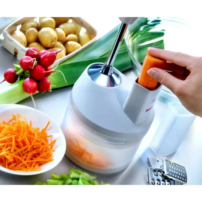 - SliceSy inclus avec 5 râpes (julienne fine, moyenne et grossière + rondelles fines ou épaisses + grande lame hachoir)