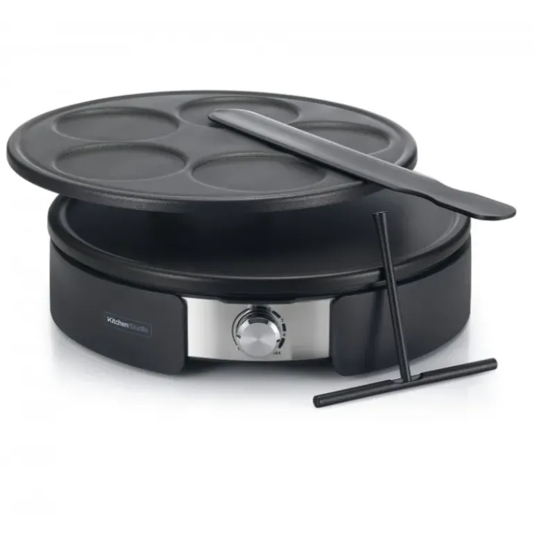 En bonus, vous retrouverez 2 accessoires inclus avec la crêpière Kitchen Studio : une spatule à crêpe et un râteau à crêpe rond en plastique de couleur noire. La spatule pour crêpe sera là pour manipuler facilement vos crêpes et le répartiteur à crêpe vous aidera à étaler uniformément votre pâte à crêpes !