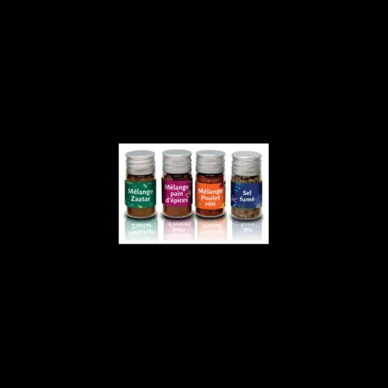 - Composition : Mélange Zaatar, noix de muscade, dip indien, sel rose fin à la truffe, mélange guacamole, mélange arrabiata, mélange poulet rôti, fleur de sel aux épices toastées, poivre noir de Kâmpôt, piment Kashmiri, sel dégustation foie gras, poivre noir fumé de Tellicherry, mélange cajun, quatre épices, baies de verveine, gingembre, poivre au citron pour poissons et fruits de mer, baies roses, curry breton, mélange pain d’épices, mélange crumble, mélange spéculoos, création pour desserts fruités.