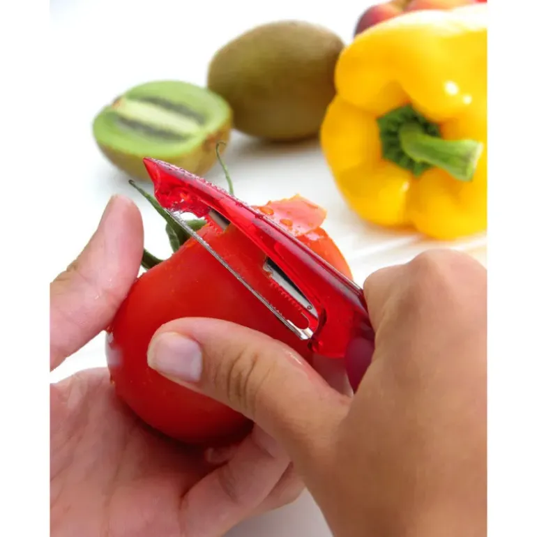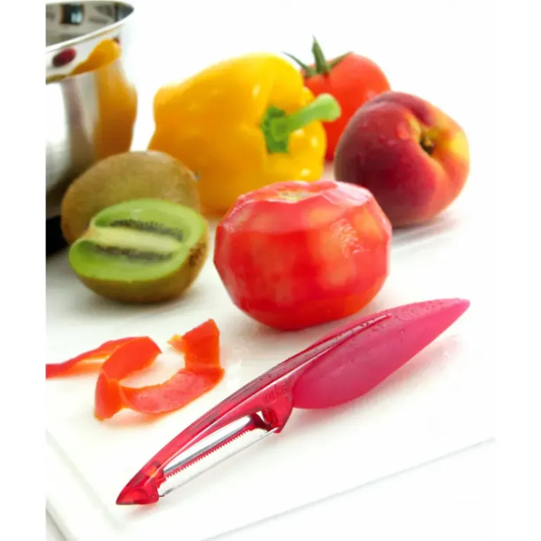 L’éplucheur Peaux fines et délicates Elios est l’outil idéal pour peler les kiwis, les tomates, les pêches, les poivrons, etc… grâce à sa lame dentelée.