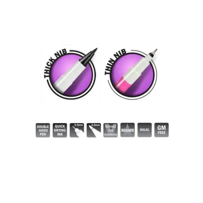 Grâce au feutre alimentaire Rainbow Dust vous allez pouvoir réaliser des travaux de précisions. Composé de 2 mines, vous pouvez aussi bien effectuer du coloriage avec la pointe feutre de 2,5 mm que dessiner des yeux et de fins détails avec la pointe de 0,5 mm. Pour une efficacité optimale, nous vous conseillons d’utiliser le feutre alimentaire Rainbow Dust sur des surfaces fermes. Laissez sécher votre pâte à sucre, gum paste ou pâte d’amande pour avoir un résultat idéal.