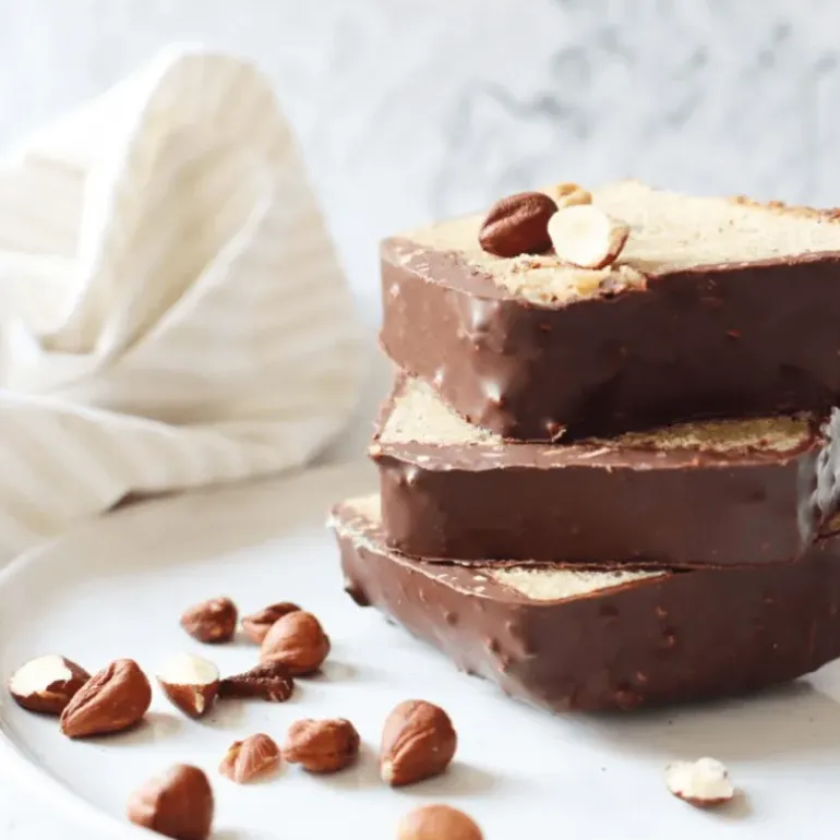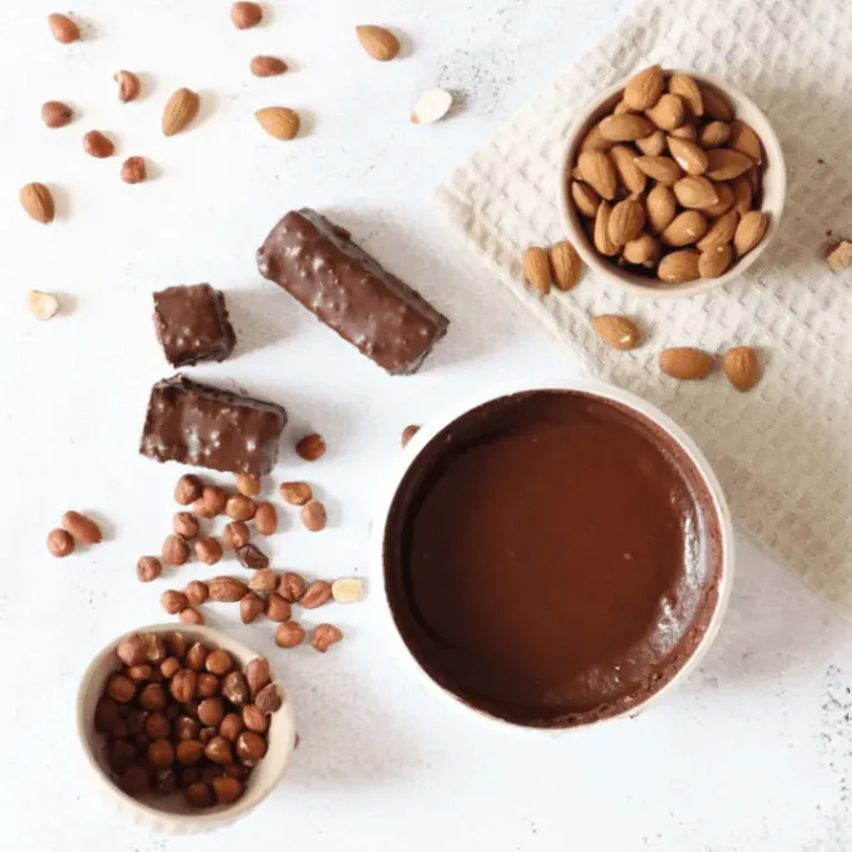 - Ingrédients : Chocolat noir 70% (pâte de cacao, sucre, émulsifiant (lécithine de soja), arôme naturel), huile de tournesol, noisettes caramélisées 4%, amandes caramélisées 3%