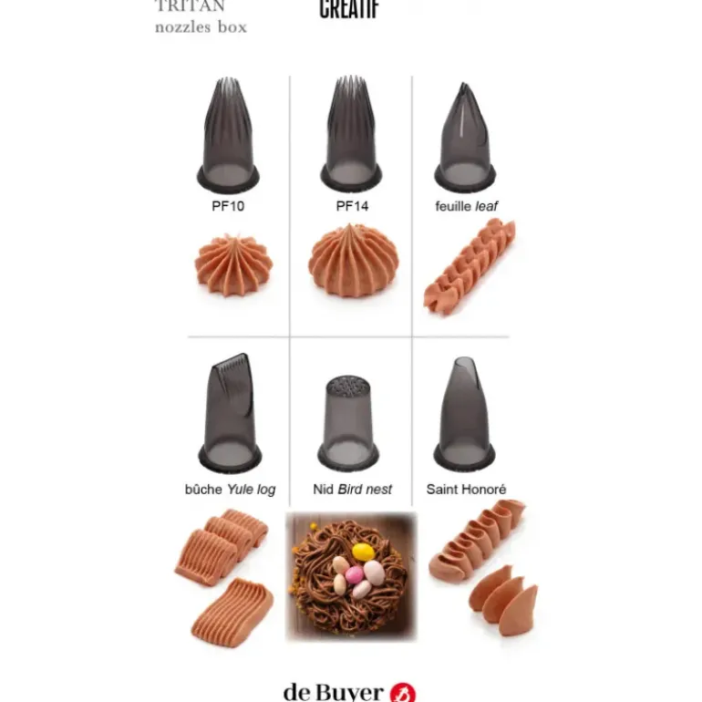 Dans cet Assortiment de 6 Douilles, vous retrouverez la Douille à Vermicelles, aussi connue sous le nom de Douille à Nid, qui est souvent utilisée pour réaliser des nids de Pâques. Enfin, ce lot contient également une Douille Feuille idéale pour la décoration de vos gâteaux, ainsi que 2 Douilles Cannelées qui vous serons utiles pour réaliser des tourbillons et dresser vos mousses et vos crèmes avec élégance.
