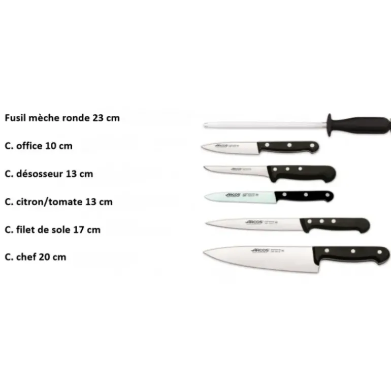 Cette sacoche est agrémentée de 5 couteaux professionnels de la marque espagnole ARCOS, dont la renom n’est plus à faire dans le secteur de la coutellerie. Ces modèles issus de la gamme UNIVERSAL sont :