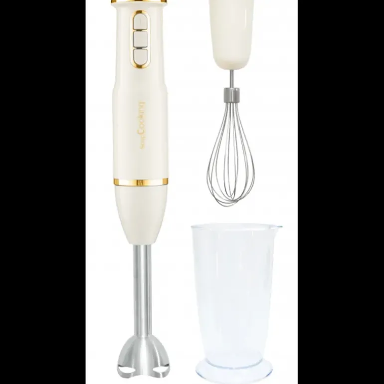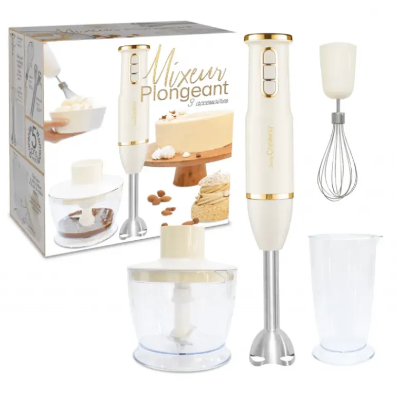 Simple d’utilisation, ce mixeur plongeant répondra à toutes vos attentes. D’une dimension de 42 cm de long pour 5,5 cm de diamètre, le mixeur Scrapcooking est livré avec plusieurs accessoires. Vous retrouverez ainsi un verre doseur en plastique de 700 ml, un broyeur ainsi qu’un fouet inox. La particularité de ce mixeur plongeur est qu’il dispose également d’un hachoir de 500 ml avec des lames en inox.
