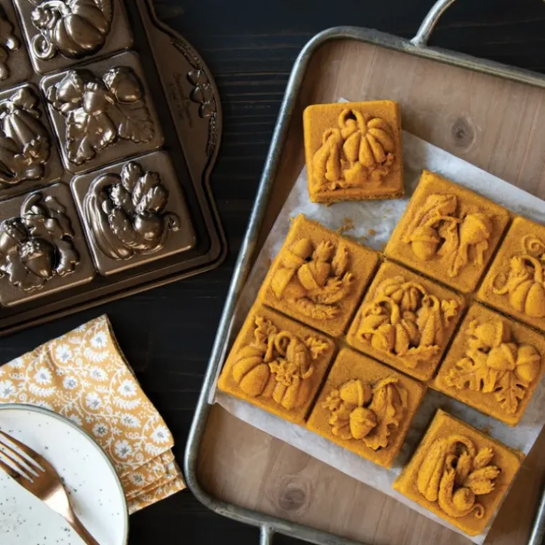 Savourez un thé ou un café avec un assortiment de gâteaux gourmands aux motifs automnaux. Nordic Ware a mis au point un moule à gâteaux de neuf empreintes dont les motifs font honneur à la saison des récoltes.
