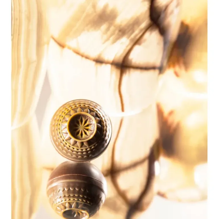 Pour obtenir une sphère, il suffit d’assembler 2 moulages rosaces ou bien d’assembler un bonbon rosace à une demi-sphère lisse grâce au moule chocolat demi-sphère Ø3 cm (x24) Chocolate World.