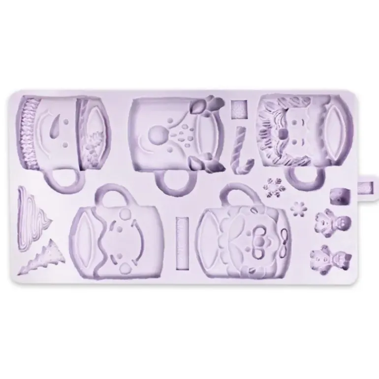 Ce moule en silicone vous permet de réaliser facilement des biscuits, des chocolats ou modeler des décorations en isomalt, pâtes à sucre ou amande en forme de Tasses Festives reflétant les emblématiques personnages de Noël: le Père-Noël, la Mère-Noël, le Renne, le Bonhomme de Neige et le délicieux Bonhomme Pain d’Épices.