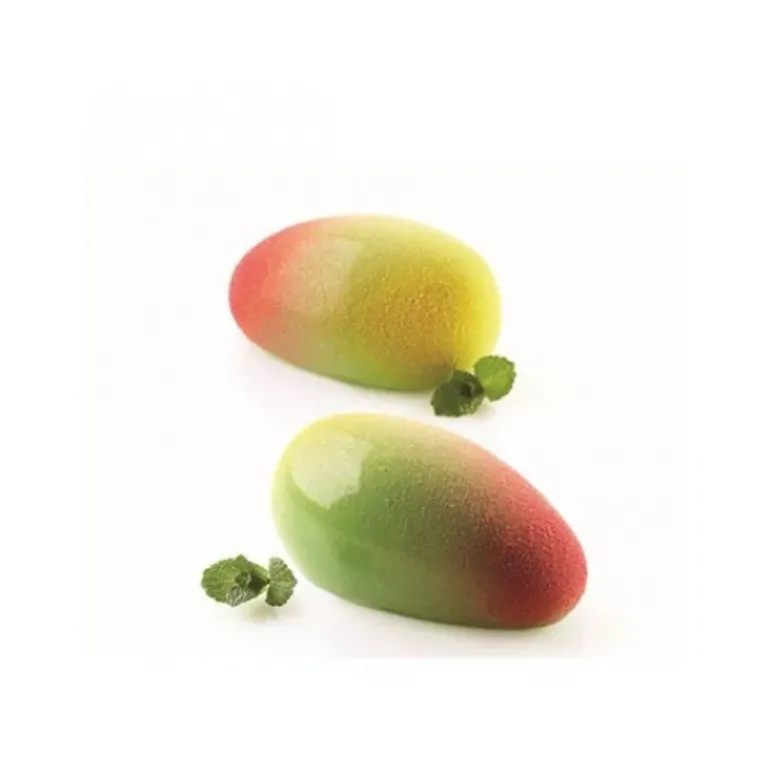 Une fois vos créations aisément démoulées grâce à la matière anti-adhésive du moule, vous pourrez fièrement les présenter à vos convives à l’heure du dessert ! Pour un effet des plus renversants, recouvrez vos mangues de leur plus beau pelage rouge, vert et jaune à l’aide d’un spray velours.