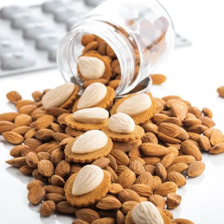 Craquante, douce, gourmande, l’amande est fruit sec utilisé dans de nombreuses recettes. Rendez honneur à cet ingrédient essentiel en confectionnant des gâteaux à son image. Le moule en silicone gourmand amande possède 30 empreintes à la forme ronde et allongée et au réalisme épatant ! Avec les bons ingrédients et un peu d’huile de coude, vous pourrez aisément confectionner des amandes en trompe-l’œil.