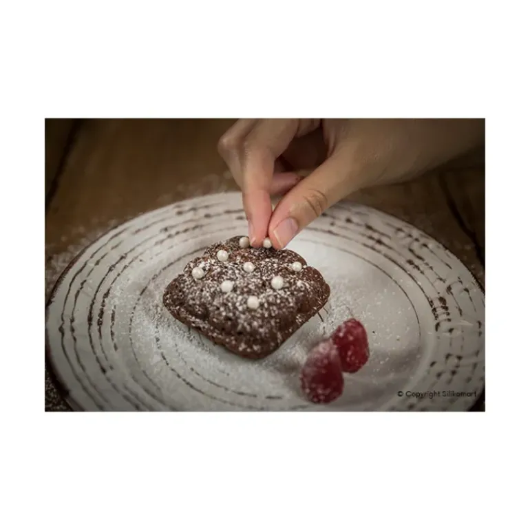Pour souligner l’effet matelassé du moule silicone Mini Eleganza Silikomart 3D Design, vous pouvez le décorer de perles de sucre, ou ajouter des points de purée de fruits gélifiée.