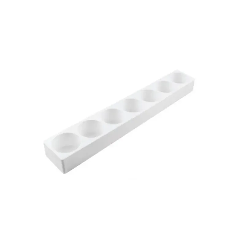 Le moule silicone 7 cylindres vous permet de créer des cylindres plats, très élégants à utiliser tels quels, à insérer entre deux coques de macarons ou entre deux disques de chocolat pour créer des bouchées sucrées qui sortent de l’ordinaire. Grâce à sa composition sous forme de barre en silicone de 7 empreintes, vous pourrez d’un seul geste lisser à l’aide d’une spatule plate la surface de vos cylindres pour un résultat parfait lors du démoulage.