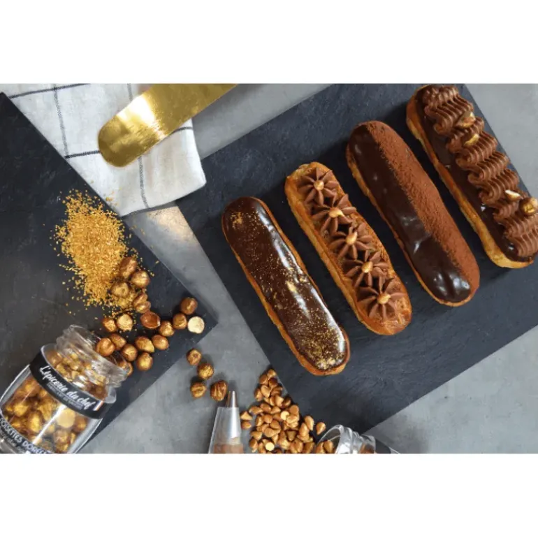 Proposées par la marque française L’Epicerie du Chef, ces noisettes entières sont recouvertes d’un colorant alimentaire sous forme de poudre dorée. 100% comestibles ces noisettes dorées donneront une touche croquante et brillante à vos pâtisseries.