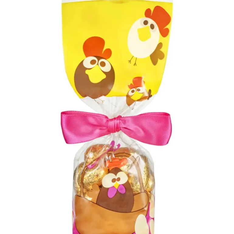 Le sachet avec fond cocotte se pare d’un motif de Pâques, représentant quatre poules, des oeufs et un panier. Le centre du sachet avec fond est transparent, laissant apercevoir son contenu gourmand. Vous pouvez nouer un ruban sur le sachet avec fond cocotte afin de fermer le sachet tout en soignant la présentation finale.