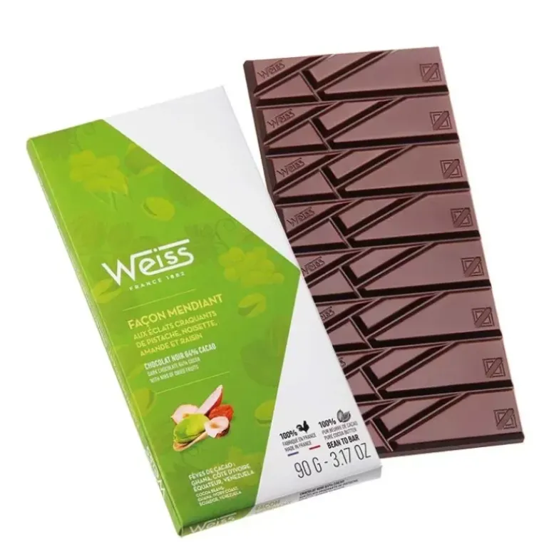 Retrouvez désormais la Tablette de Chocolat Noir Mendiant 64% 90 g Weiss. Une tablette de chocolat noir reprenant la traditionnelle recette du mendiant, associée à des éclats de pistache, noisette, amande et raisin.
