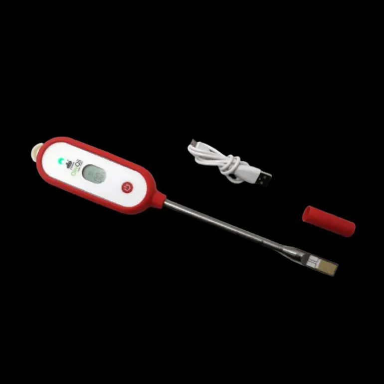 Très pratique, cet appareil fait également office de thermomètre alimentaire. Fabriqué en France et adoptant une couleur rouge chaleureuse, ce thermomètre digital dispose d’une batterie au lithium rechargeable par câble USB. Ce thermomètre de cuisine offre une précision au degrés près et est utilisable sur des températures allant de -50 à +250 degrés.