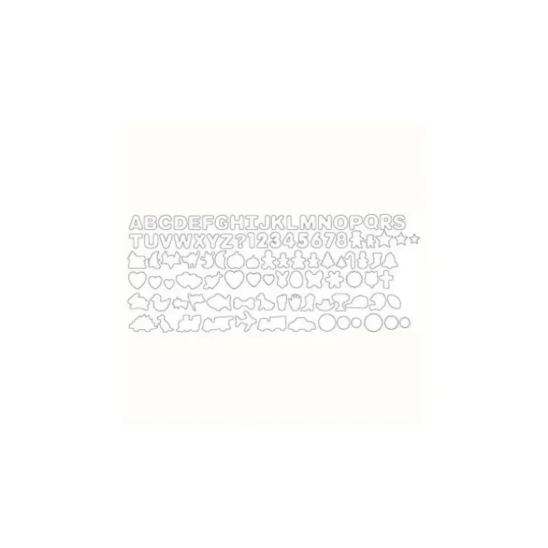 tout l’alphabet / les chiffres de 1 à 8 / 3 coeurs de tailles différentes / 3 coeurs à bordures festonnées de tailles différentes / 1 double coeur / 1 coeur transpercé d’une flèche / 1 tête de lapin / 1 oeuf / 2 citrouilles de tailles différentes / 1 fantôme / 1 lune / 1 chat angoissant / 1 maison hantée / 1 sorcière / 1 chauve-souris / 1 garçon / 1 fille / 2 sapins de Noël de tailles différentes / 1 bonbon / 1 bonhomme de neige / 1 entrepôt / 1 clochette / 1 pied / 1 main / 1 botte / 1 chapeau de cow-boy / 1 étoile filante / 1 drapeau / 3 cercles de tailles différentes / 3 étoiles de tailles différentes / 3 cercles à bordure festonnée de tailles différentes / 1 os / 1 chien / 1 poisson / 2 ours de tailles différentes / 1 canard / 1 stegasaurus / 1 T-Rex / 1 coupe de champion / 1 casquette de base-ball / 1 casque de football américain / 1 balle de football /1 train / 1 voiture / 1 avion / 1 camion de pompier / 1 camion benne