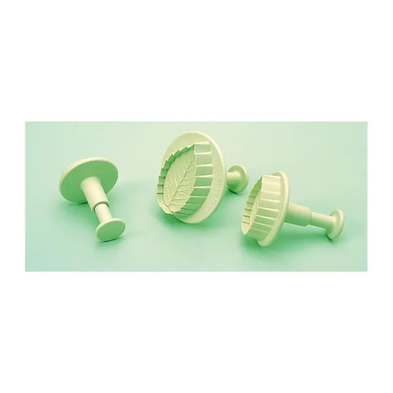 Jeu de 3 Emporte pièces à Poussoir. Le poussoir permet l’extraction facile de la pâte découpée. Ces découpoirs permettent également de marquer sur la pâte les nervures des feuilles.