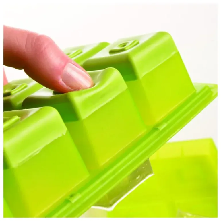 Le design de ce bac glaçon a été soigneusement étudié pour vous faciliter la vie : grâce à son fond souple, il vous suffit d’une légère pression pour faire tomber les gros glaçons dans le couvercle à empreinte et les servir sans plus attendre. Le couvercle du bac à glaçons vous permettra d’éviter le transfert d’odeur et d’empiler les bacs afin de gagner de la place dans le congélateur.