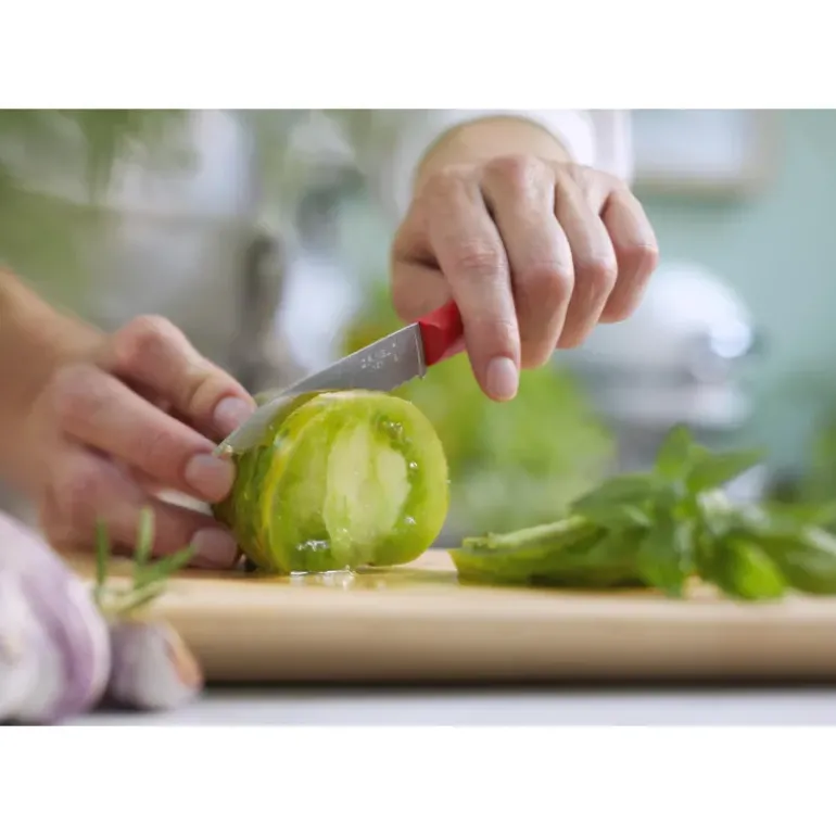 Venez à bout des ingrédients les plus difficiles à couper en utilisant le couteau d’office cranté Opinel. Issu de la collection Les Essentiels, il allie puissance de coupe et ergonomie de l’ensemble. L’équilibre entre la lame de 10 cm et le manche en polypropylène recyclé est travaillé pour vous permettre une découpe facile et efficace.