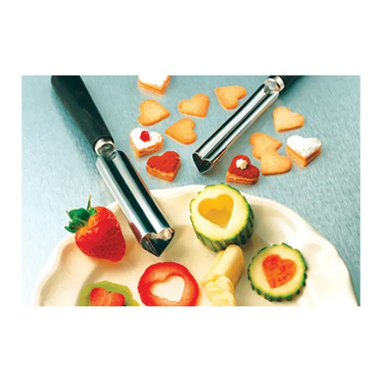 L’emporte Coeur permet de creuser des fruits et légumes pour obtenir une forme de coeur. L’emporte coeur peut également être utilisé sur des pâtes ou gâteaux.