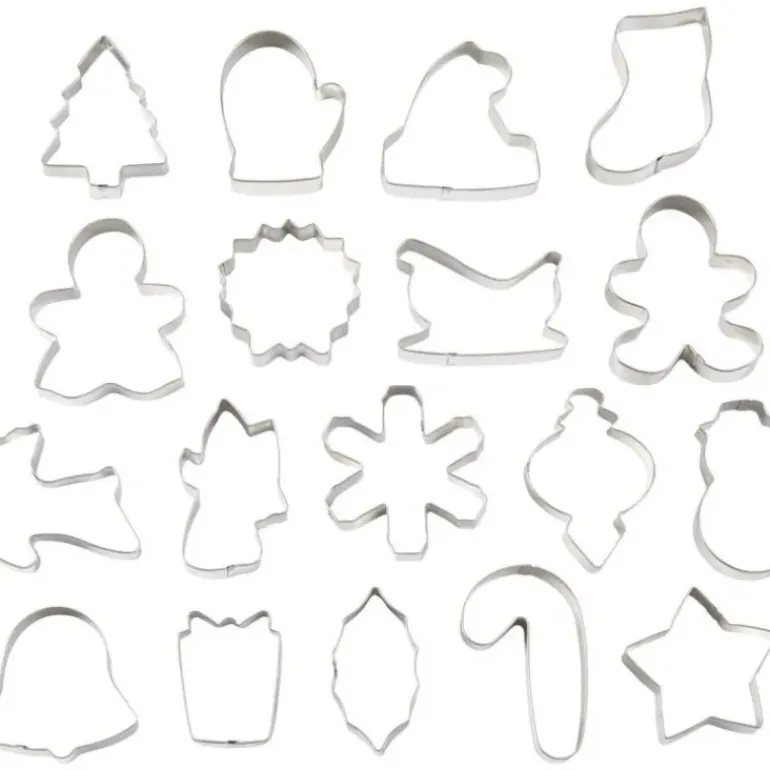 - Lot de 18 emporte pièce : flocon de neige, feuille de houx, fille en pain d’épice, étoile, traîneau, arbre de Noël, chaussette, bonhomme de neige, renne, ornement, bâton de sucre d’orge, bonnet de Père Noël, ange, cloche, cadeau, couronne, garçon en pain d’épice, et gant