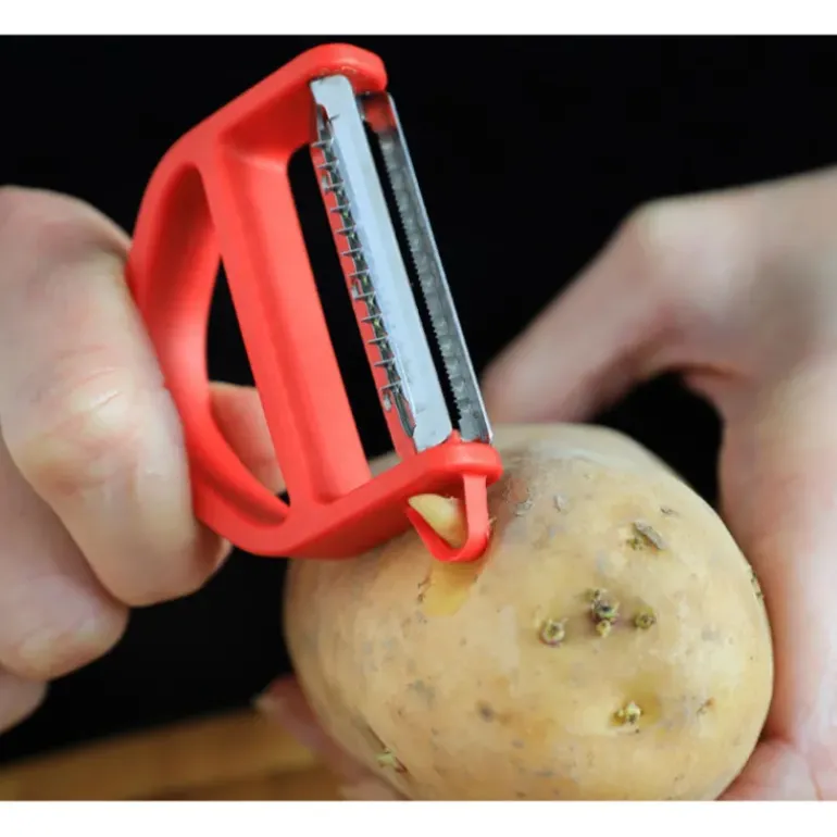 En effet, il ne s’agit pas là d’un simple éplucheur : peler, couper en julienne, et enlever les yeux des pommes de terre, toutes ces tâches sont à la portée de cet ustensile de cuisine. Les deux lames en inox assurent l’épluchage et la taille de vos fruits et légumes, tandis que l’embout enlève-yeux vous débarrassera des parties non comestibles des aliments.