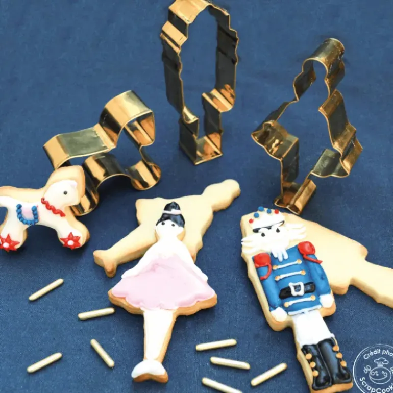 Redonnez la vie au prince casse-noisette et à la fée dragée en créant des pâtisseries uniques. Une fois la forme générale détaillée à l’aide des emporte-pièces en inox, il ne vous restera qu’à cuire et décorer vos biscuits. Ajoutez couleur et paillettes à vos biscuits et vous obtiendrez de quoi faire saliver petits et grands.