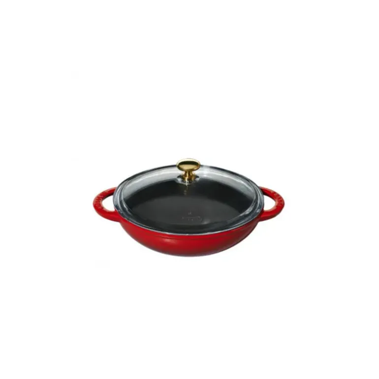Chasseur vous propose un wok d’origine française robuste et compatible avec toutes les sortes de feux. Pourvu d’une double poignée et d’un couvercle en verre, le mini wok de 18 cm se manie aisément. L’émaillage couleur rubis (rouge) est réalisé à la main et apportera une touche lumineuse à votre cuisine.