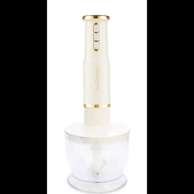 Proposé dans un design à la fois sobre et élégant, ce hachoir mixeur se pare d’une couleur crème finition mate avec un liseré doré pour la touche “wouah”.