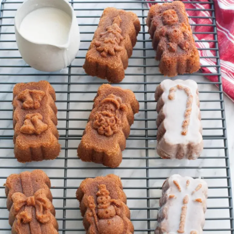 Que vous réalisiez une seule pâte pour remplir les huit empreintes du moule Nordic Ware, ou que vous personnalisiez les saveurs pour convenir aux goûts de chacun, cela dépend de vous. Dans tous les cas, vous obtiendrez des cakes de Noël aux détails somptueux : paquet cadeau, bonhomme de neige ou en pain d’épices, sapin de Noël, bougie, cloches, canne en sucre d’orge, et Père Noël prendront vie sous la forme de pâtisserie.