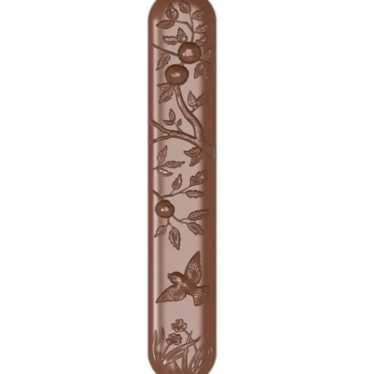 Ornez vos éclairs d’une élégante barre de chocolat réalisée à l’aide du Moule Chocolat Barre pour Eclair Chocolate World. Celle-ci est ornée d’un motif Belle Epoque avec des branches juste fleuries, des fleurs et un oiseau. La barre de chocolat apporte une finition plus soignée que le glaçage, ainsi que du croquant à une pâtisserie où le moelleux et le fondant domine généralement.
