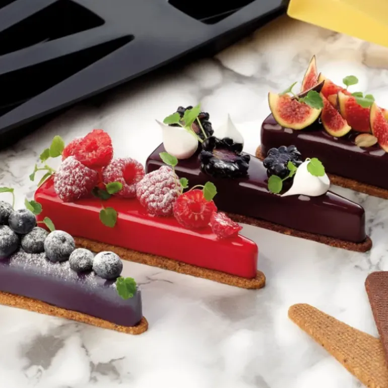 Pour un dessert original, servez des entremets déjà sous forme de parts grâce au Moule Silicone Slake imaginé par le chef pâtissier Nicolas Bacheyre. D’une hauteur de 2 cm, chaque empreinte possède une forme triangulaire semblable à une part de gâteau de 11,4 x 3,9 cm.