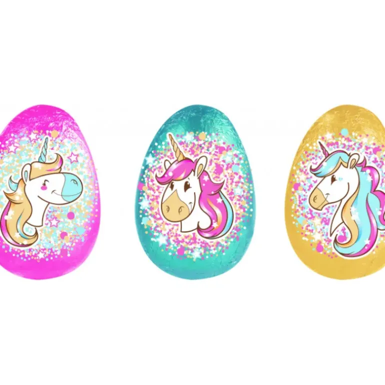 Pour changer des lapins, poules, cloches et fritures de Pâques traditionnels, les oeufs en chocolat sont emballés individuellement pour vous permettre de les cacher lors de la chasse aux oeufs de Pâques. Au chocolat au lait, les chocolats de Pâques sont conditionnés par boîte de 50, avec 3 emballages différents représentant des licornes.