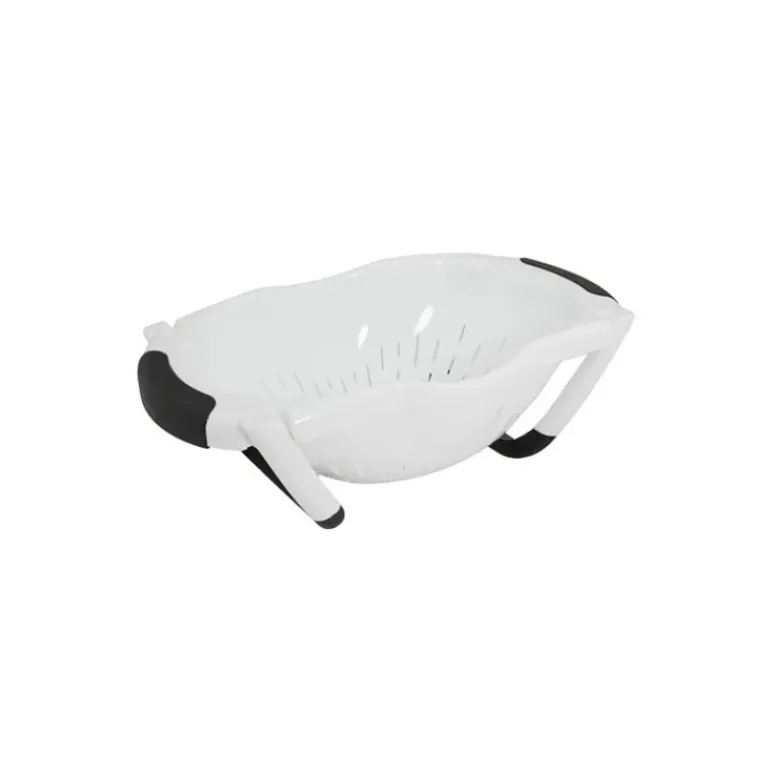 Les poignée antidérapante de cette astucieuse passoire peuvent servir de socle, et peuvent se déplier pour être posées de part et d’autre de l’évier, et donc servir d’égouttoir à évier.