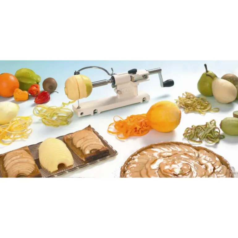 Le Pèle pomme Kali pèle, coupe et évide les fruits à trognons en une seule opération. Peut être utilisé pour éplucher les pommes de terre et les trancher (chips…), pour faire des zestes de citrons et d’oranges…