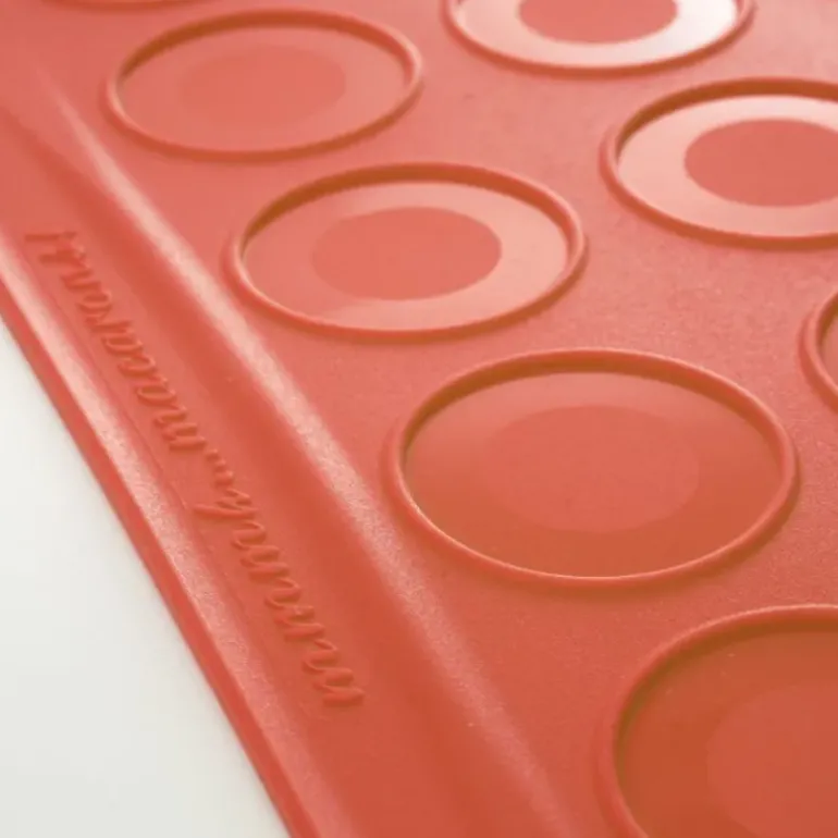 Plaque en silicone avec empreintes pour confectionner des macarons parfaitement réguliers.