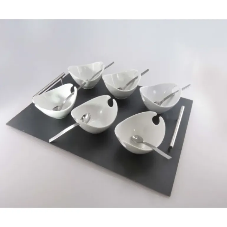 Cet ensemble associe simplicité et modernité par l’harmonie du blanc des coupelles et du noir de l’ardoise, surmonté de légères teintes argentées des poignées et des cuillères.