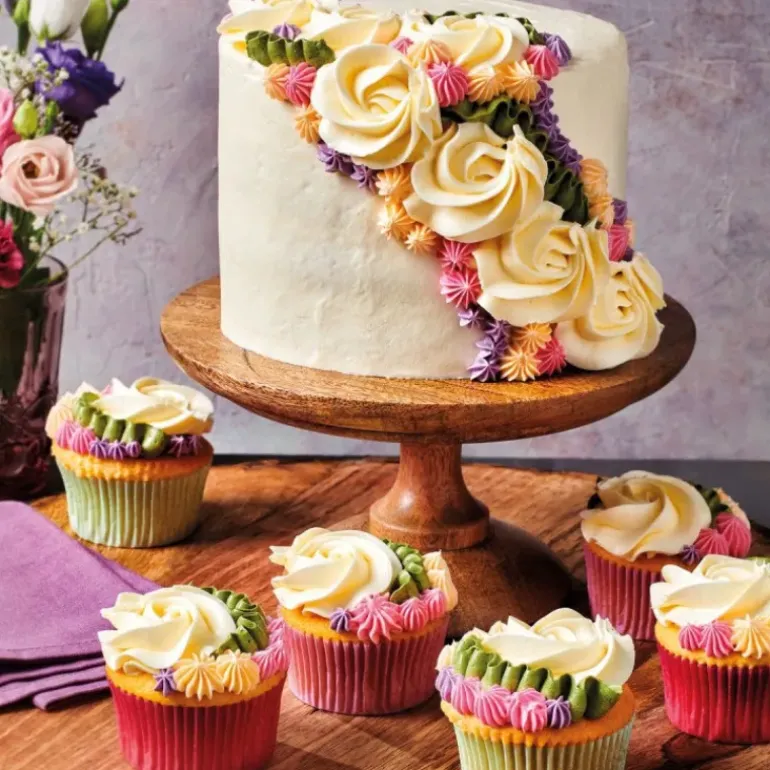 Pour décorer une douzaine de cupcakes ou un gâteau de 20 cm de diamètre, mélangez 125 g de préparation pour crème au beurre Funcakes à 125 ml d’eau. Une fois la préparation bien lisse, laissez-la reposer au frais 1h.